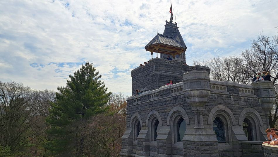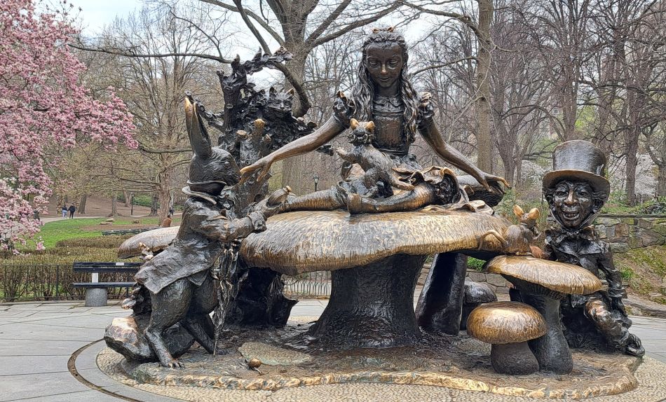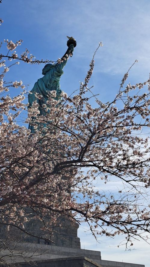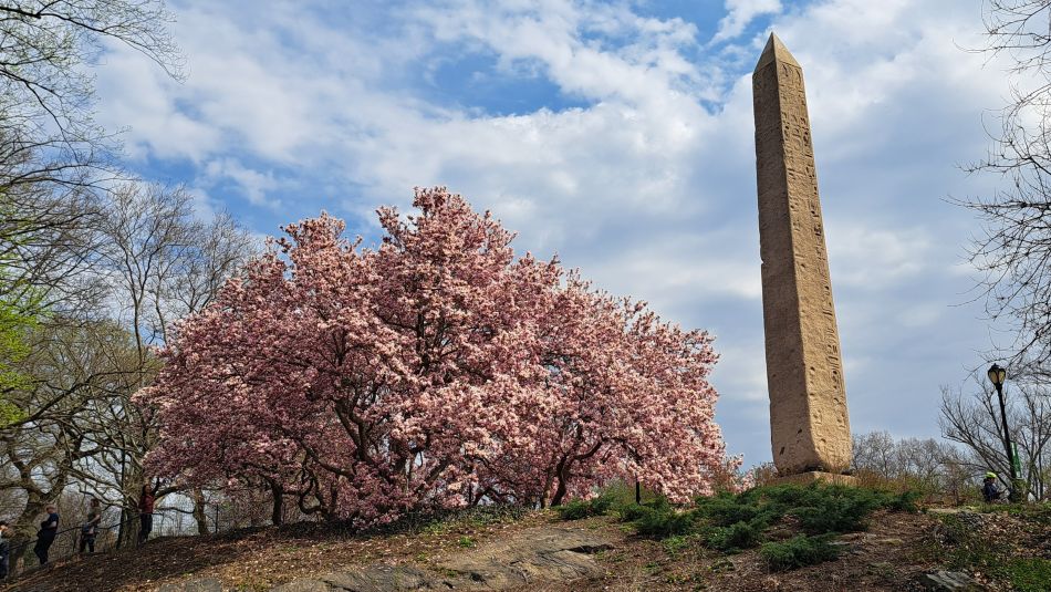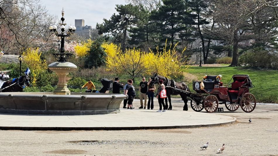 黄色のレンギョウと噴水の向こうにサクラが見えています ― セントラルパーク