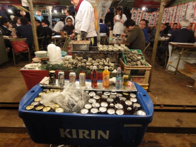 缶ビールのうしろにサザエのつぼ焼きが