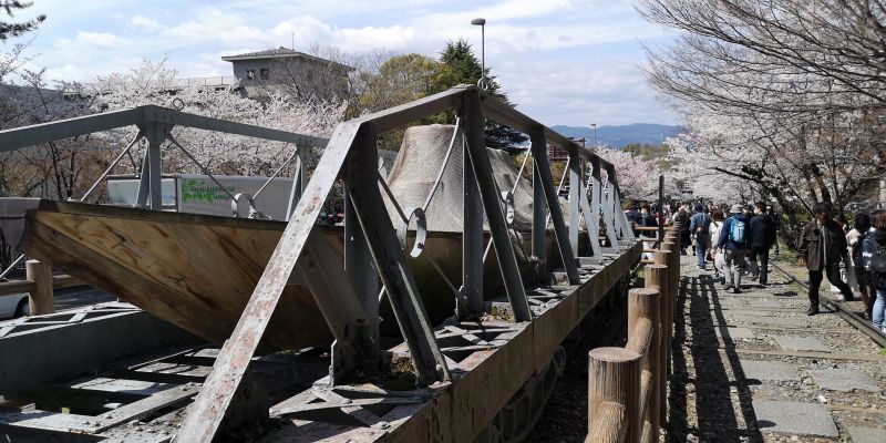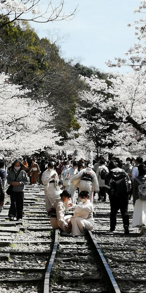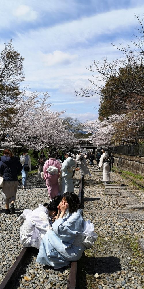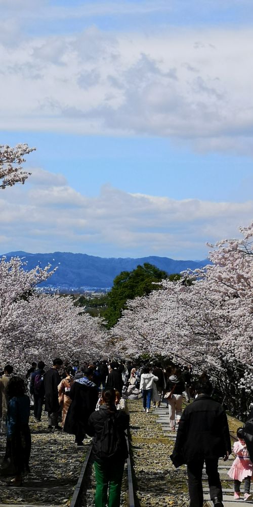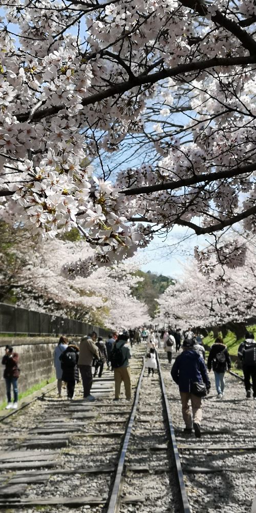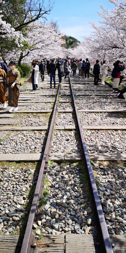 2022.04.01. 13:08 平安神宮から少し南東に歩くと桜のトンネルと幅の狭い線路が?