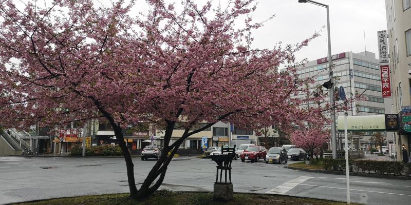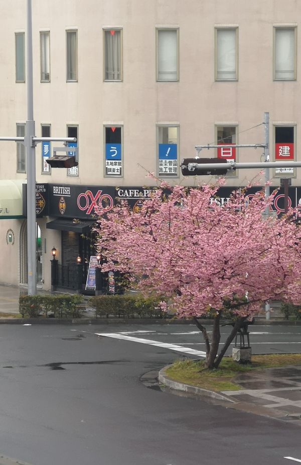 ホテルの前に早咲きの桜が、もう満開ですね