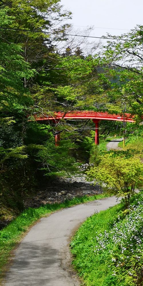 駅から見える赤い橋が駅名の由来となった極楽橋です