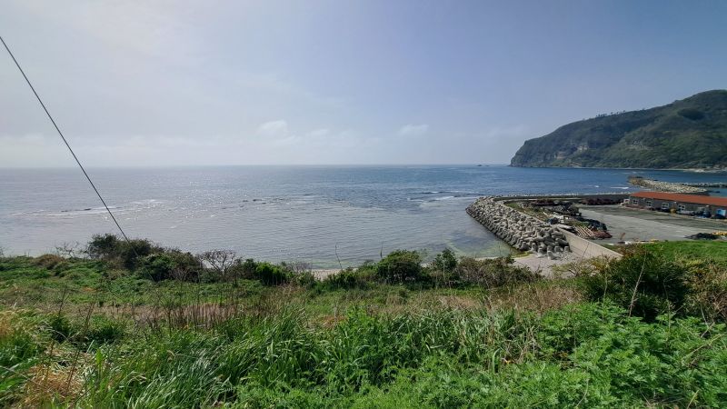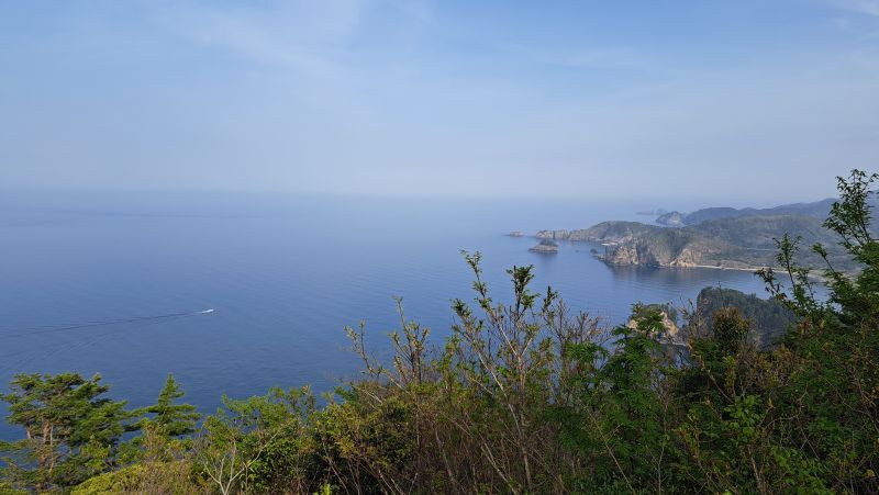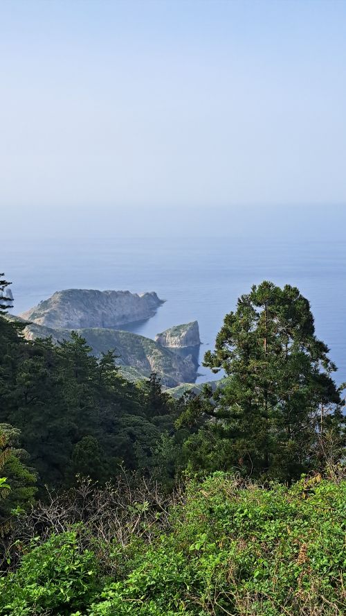 波はおだやかで春霞のため水平線が分からず、海がそのまま空につながっているように見えます