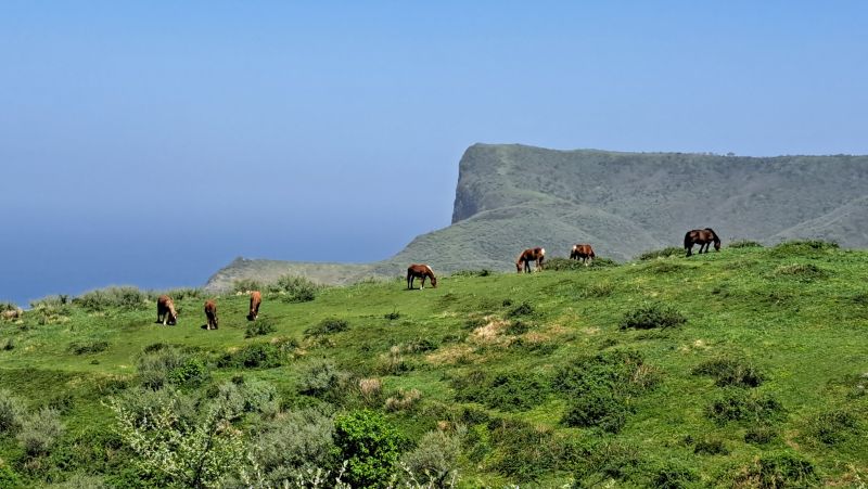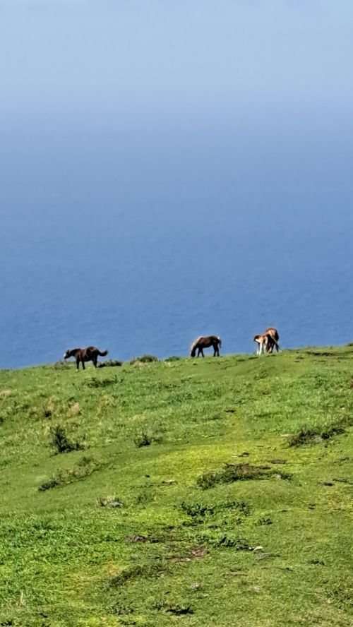 馬が放牧されている向こうに海が見えています