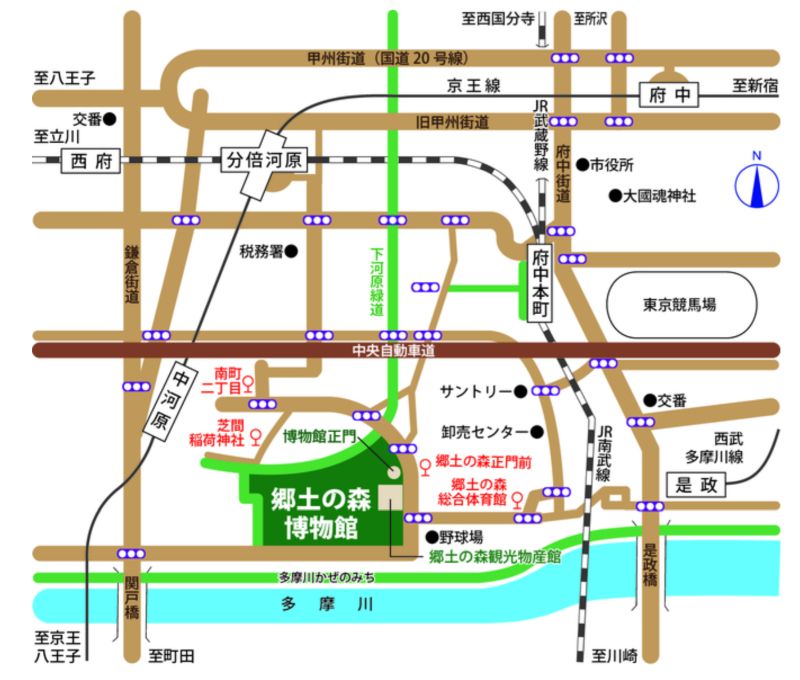 郷土の森はJR線・京王線の分倍河原(ぶばいがわら)駅から南に位置していて