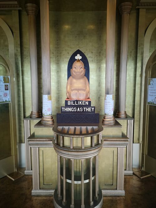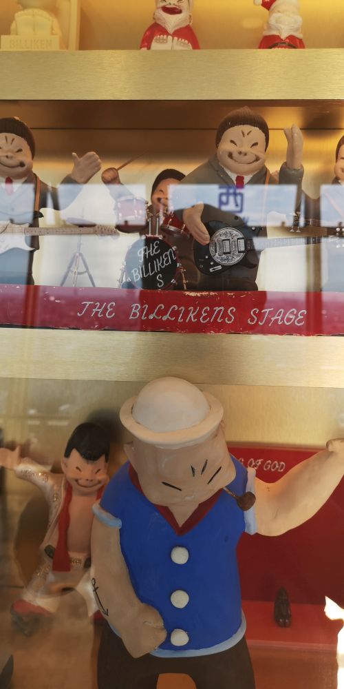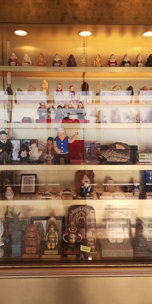 光が反射して分かりにくいですが色んなビリケンさんが展示されていました