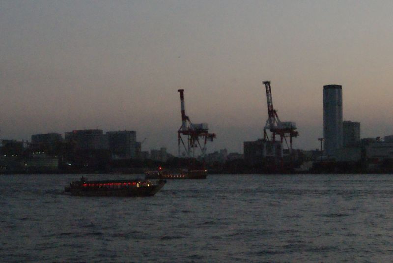 屋形船の向こうにはダイナソーのような大型クレーンが