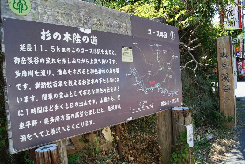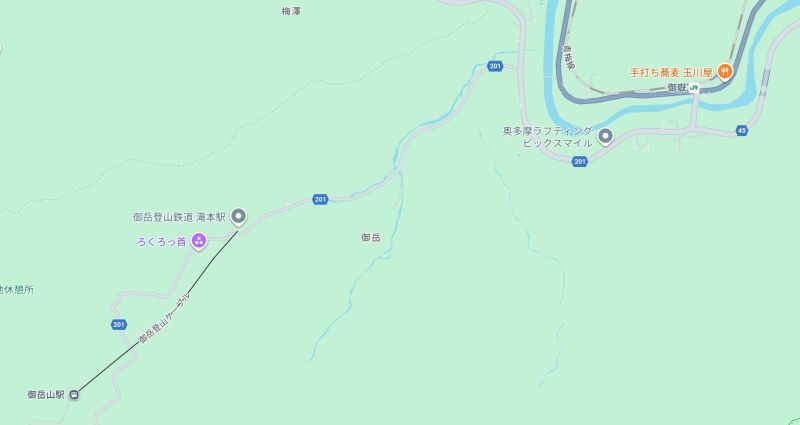 地図右上の御嶽駅からケーブルカーの滝本駅まで歩き、御嶽山駅でレンゲショウマを探すことになります