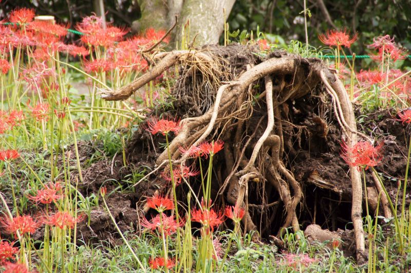 強風で倒れたのであろう木の周りに咲いている彼岸花は