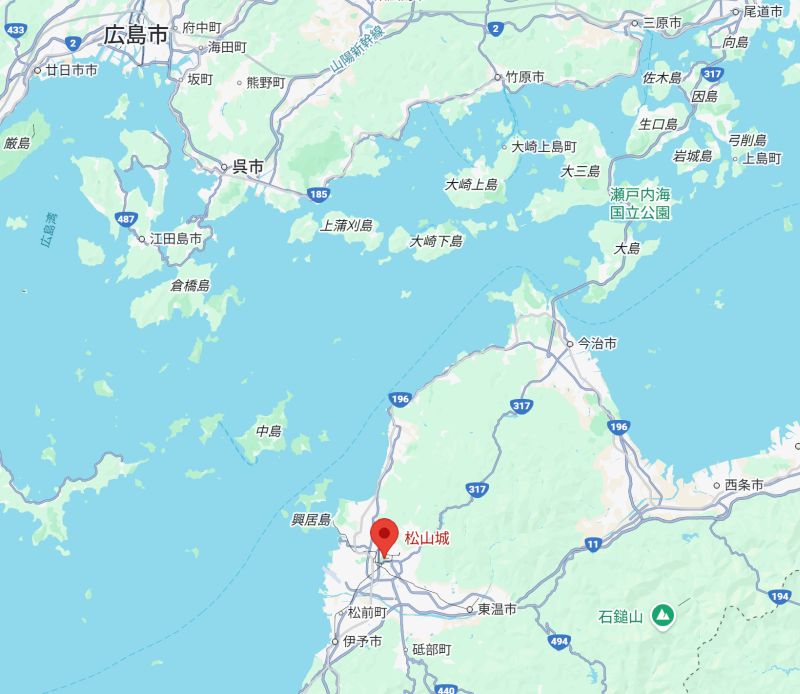 位置関係はこんな感じで、松山観光港と呉はフェリーや高速船でつながっています