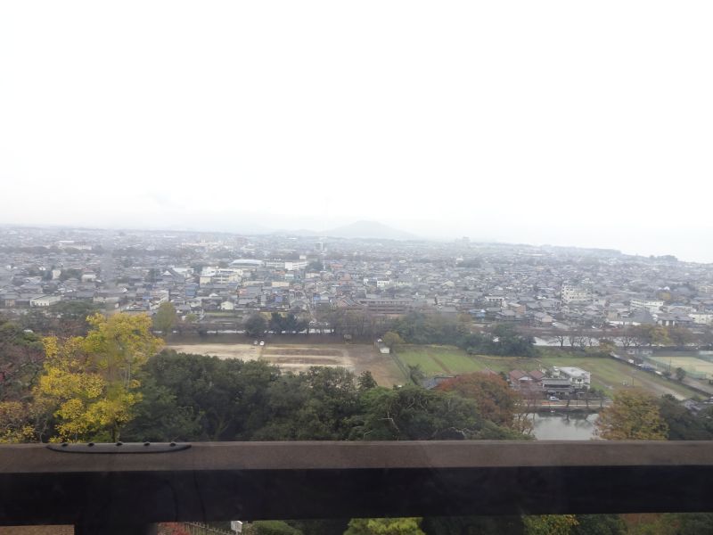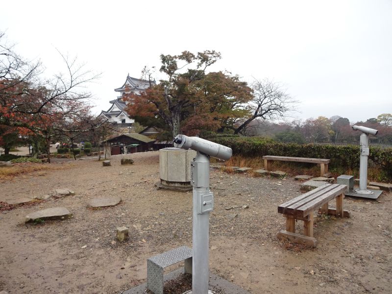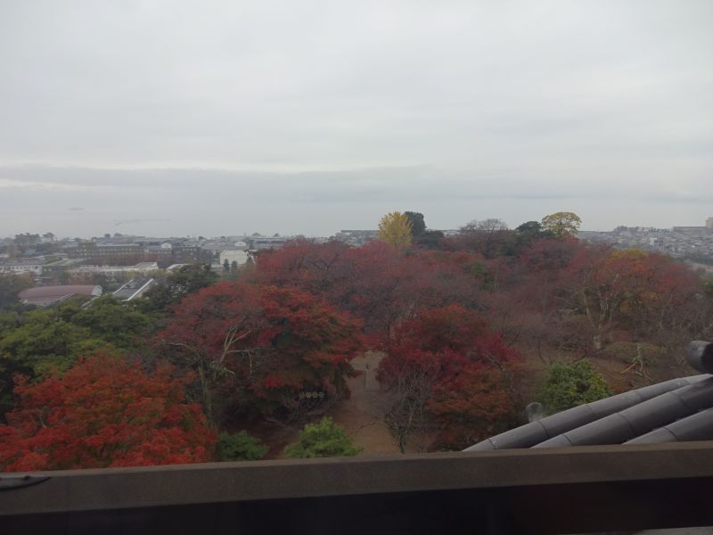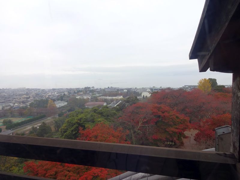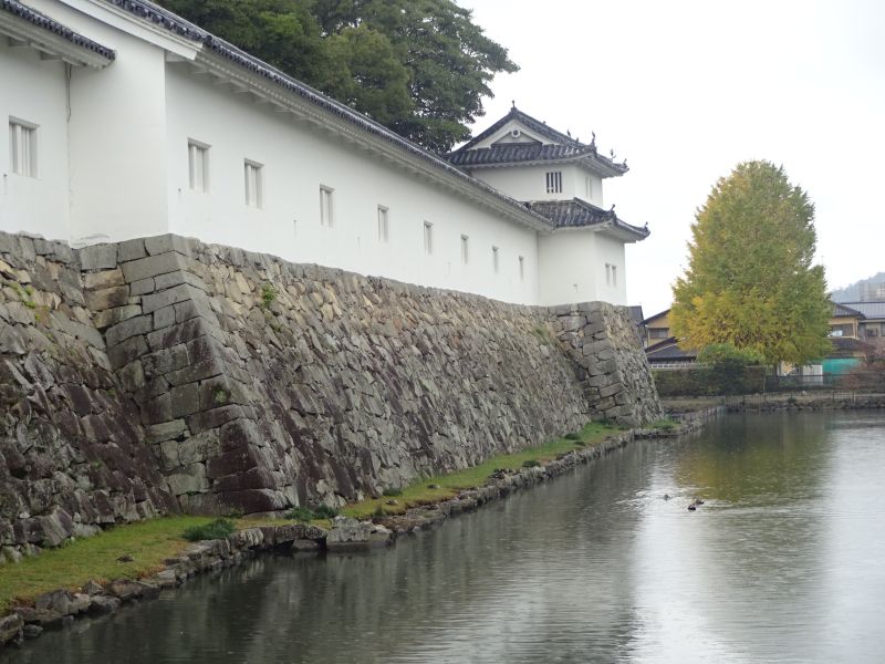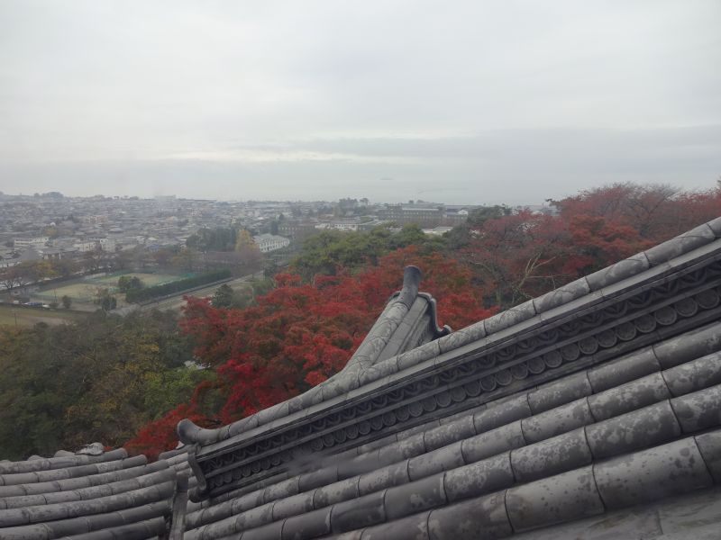 お城の西側(正確には北西)はほど近くまでびわ湖が迫っています 紅葉の木々のすぐ先ですがお分かりいただけるでしょうか?